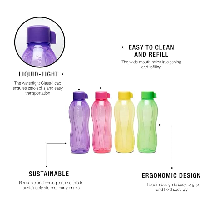 Tupperware Aquasafe Plastic Bottle, 1000ml, Set of 4, Pink, Green, Yellow, Purple